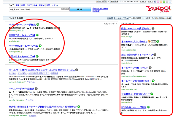 例えば yahooの検索で"奈良県 ホームページ作成" と検索したのが下記の画面です。